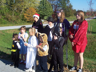 Our neighborhood Halloween Parade group — mine is the Darth Vader in the front row.